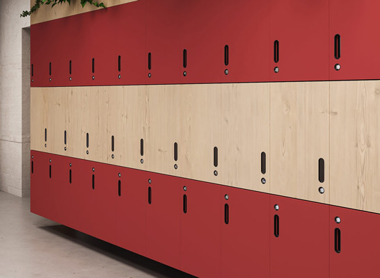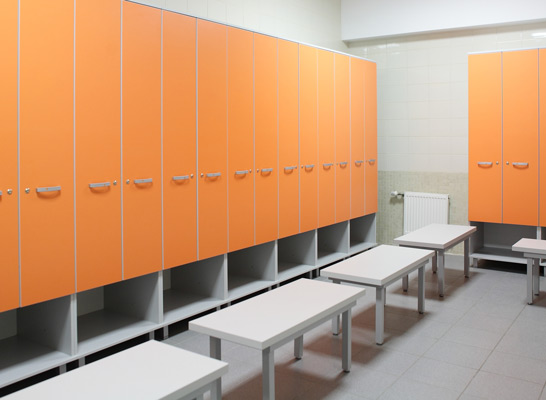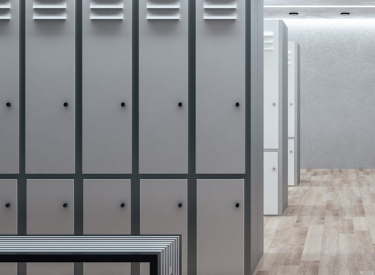 En instalaciones deportivas se prioriza la durabilidad, la robustez para usos muy intensivos y la capacidad de ser resistentes en medios húmedos, cerca de duchas y zonas de agua donde materiales como el HPL es imprescindible.